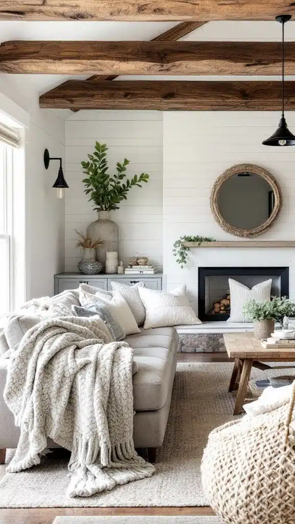 Rustic chic living room design combines the charm of reclaimed wood beams and shiplap walls with the comfort of neutral-toned furniture. The earthy color palette, enriched by creamy whites and warm browns, creates a soothing and grounded atmosphere. Chunky knit throws and linen cushions add layers of texture, while black metal light fixtures introduce a sleek, modern contrast. This harmonious blend of farmhouse coziness and contemporary polish makes the space inviting, stylish, and timelessly appealing.