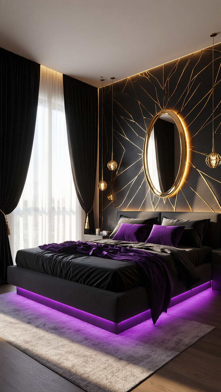 Luxurious 14'x16' bedroom at golden hour with black velvet curtains, king-size bed with black satin sheets and purple pillows, purple LED underglow, gold accents, and black and gold geometric mural.