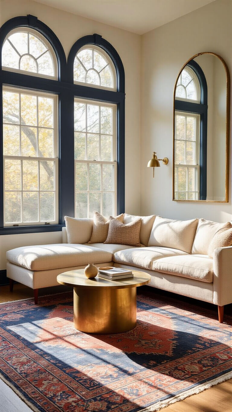 Cozy 12x14ft living room at golden hour with sunlight streaming through floor-to-ceiling windows, cream L-shaped sofa, round brass coffee table, layered Persian rug, white walls with navy trim, and arched mirror reflecting warm light.